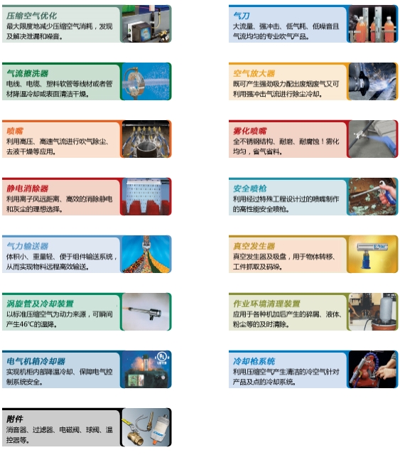 美國依愛(EXAIR)公司作為世界智能型壓縮空氣利用工具的鼻祖,34年來一直致力于開發(fā)和制造以壓縮空氣為動源的應用工具,主要包括超級氣刀、空氣增強器、渦旋管冷卻器、氣力輸送系統(tǒng)、電氣機箱冷卻器、氣刀式離子靜電消除器等等,可廣泛應用于自動化、電子電氣、食品飲料、制藥、包裝、汽車制造、塑膠、冶金、鋼鐵、化工、紡織、造紙、印刷、機械加工、儀器儀表等行業(yè)中,進行除塵去液、吹氣干燥、降溫冷卻、物料傳輸、消除靜電、環(huán)境清理等。